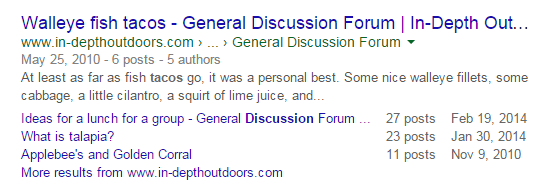 Discussion forum results sometimes show a special snippet with links to related results. These appear as individual rows below the snippet, and may show additional data.